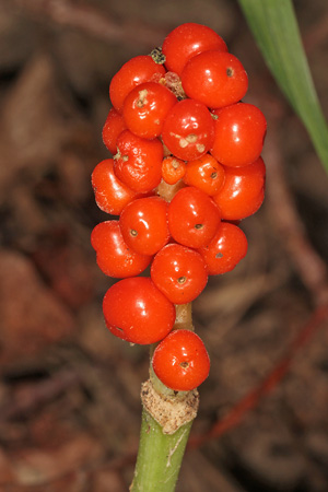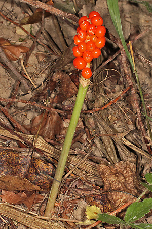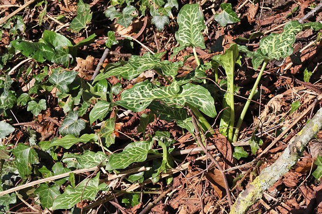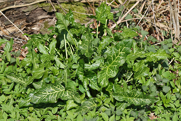 | Die Blattspreiten des Italienischen Aronstabes (Arum italicum) besitzen auffallend weißliche Adern; das Hochblatt (Spatha) ist innen weiß, außen aber weißlichgrün und verdeckt einen gelben Kolben (Spadix). |