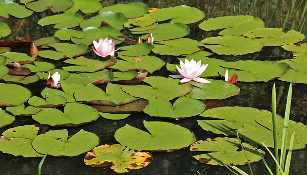 | Kultursorten von Nymphaea alba, etwa 'Marliacea', haben oft mehr oder weniger rosafarbene Blüten |