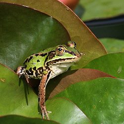 Teichfrosch (Rana esculenta) auf Teichrose · 41334 Nettetal, 14.06.2009 |