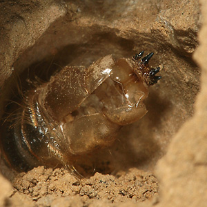 | Aufgeplatzte Trauerschweber-Puppe mit Zahnkrone in einer Lehm-Nistwand der Pelzbiene Anthophora plumipes · Solingen, 22.03.2009 |