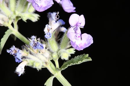 Die folgende Fotoserie entstanden als Ergänzung zur Galerie A, um auszuschließen, daß sich das Problem auf gelbe Objekte beschränkt. Als Objekt wurde (mit einer Ausnahme) ein blauer Lippenblütler mit einer toten Pelzbiene dekoriert. Im üblichen Automatikbetrieb zeigte die EOS 40D ab der zweiten Aufnahme wieder deutliche Überbelichtung, während die Ergebnisse der EOS 5D überzeugend stabil blieben.