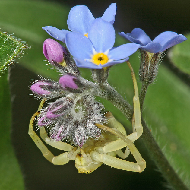 | Misumena vatia lauernd unter Vergißmeinnicht-Blüten (Myosotis sylvatica) · Solingen-Ohligs, 07.04.2009 |
