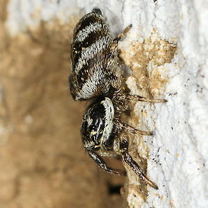 Die Zebraspringspinne ist vielen Gartenbesitzern trotz ihrer geringen Größe aufgrund ihres "Zebramusters" gut bekannt: Bereits im Frühjahr kann man die kleinen Kobolde mit ihren großen Frontalaugen beobachten, wenn sie sich auf Beutesuche ruckartig auf senkrechtem Untergrund, etwa an Mauern, Holzwänden und Zäunen entlang bewegen. Besonders vertraut sind sie jenen Naturfreunden, die an Wildbienen-Nisthilfen den Nestbau der Mauerbienen, Scherenbienen, Löcherbienen und Blattschneiderbienen beobachten: Zwischen den Nesteingängen patrouillieren oft Zebraspringspinnen auf der Suche nach Bienenparasiten, insbesondere der Taufliege Cacoxenus indagator.