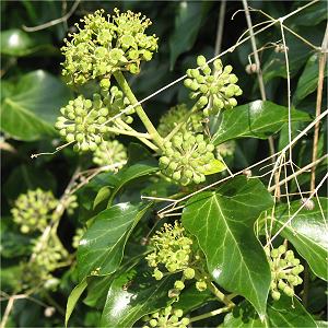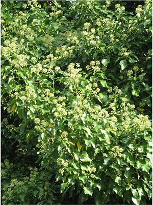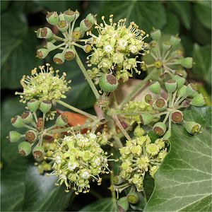 Wer im Frühherbst die wenigen noch fliegenden Insekten am blühenden Efeu beobachtet, sollte die beiden Blühstadien dieser Kletterpflanze kennen: Aus den blaßgrünen runden Knospen entsteht zunächst das erste, männliche Stadium: An der Peripherie der (leicht abgeflachten) Blütenscheibe wachsen zwischen den Blütenblättern sechs 2–3 mm lange Fäden mit hellgelben Staubbeuteln, die schließlich aufplatzen und (nach dem Abernten) bräunlich werden und abfallen. Das folgende, weibliche Stadium der Blüte ist mit der kleinen stutzenförmigen Narbe so unscheinbar, daß es leicht mit einer Knopse verwechselt wird; Insekten – etwa die auf Efeu spezialisierte Efeu-Seidenbiene (Colletes hederae) – können aber von der Scheibe bequem den offen dargebotenen Nektar ablecken, und dabei hinterlassen sie den Pollen auf der empfängnisbereiten Narbe.